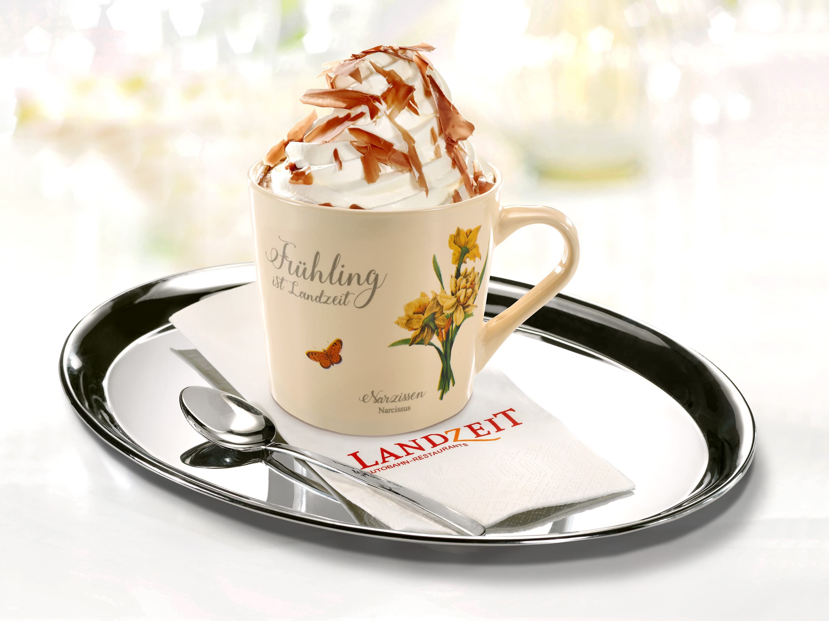 Hausgerösteter Filterkaffee mit aufgeschäumter Milch, Schlagobers und Schokoladenstreusel. Bei der Bestellung einer Landzeit Kaiser-Melange erhalten Sie die Tasse mit Frühling-, Sommer-, Herbst- oder Wintermotiv als Geschenk!