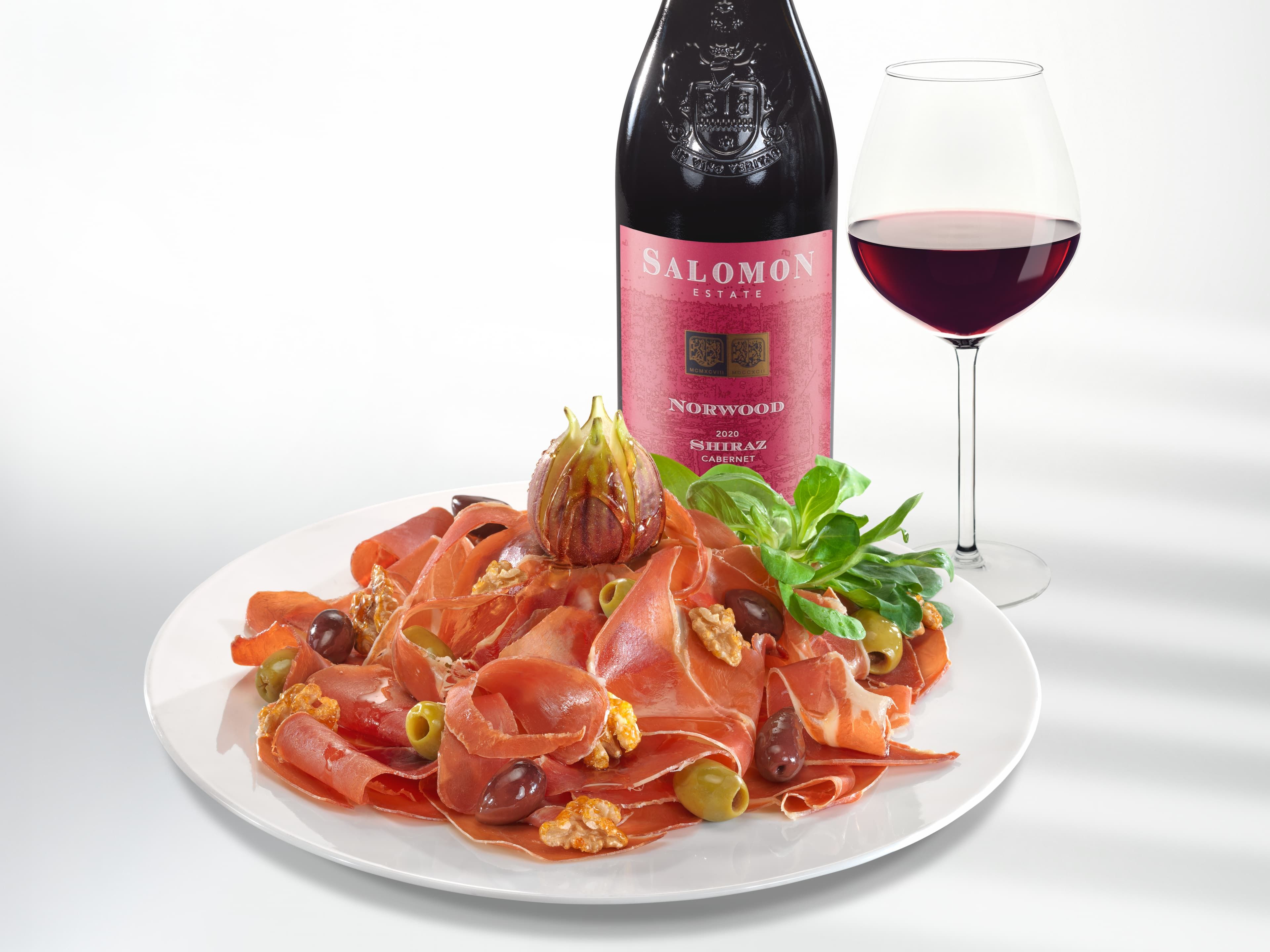 Paper-thin slices of air-dried ham from Ibérico pork, matured for 36 months, juicy and with an intense flavour of holm oak acorns, served lukewarm, garnished with caramelized walnuts, olives and honey fig.