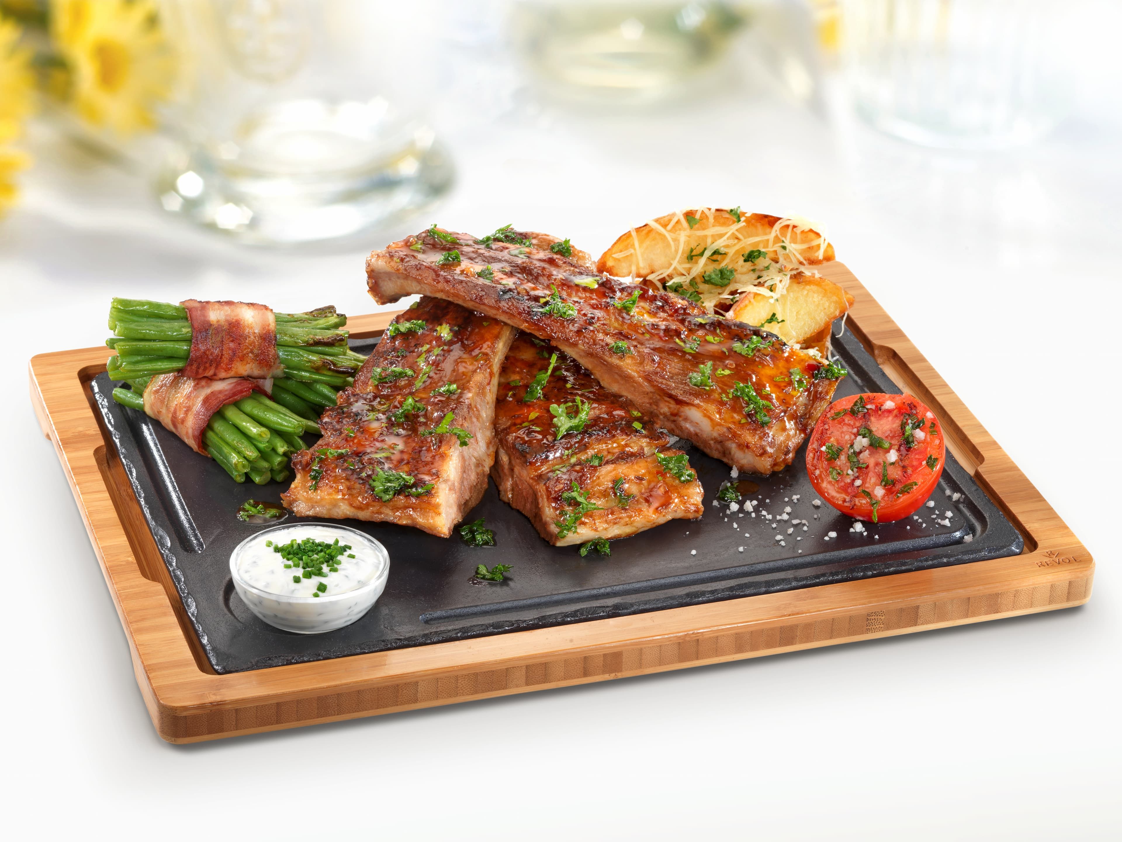 The butcher cuts the ribs from the middle section. The ribs are exceptionally juicy with a beautiful layer of meat. The special braising and grilling technique creates a smoky, caramelized, and tender flavor.