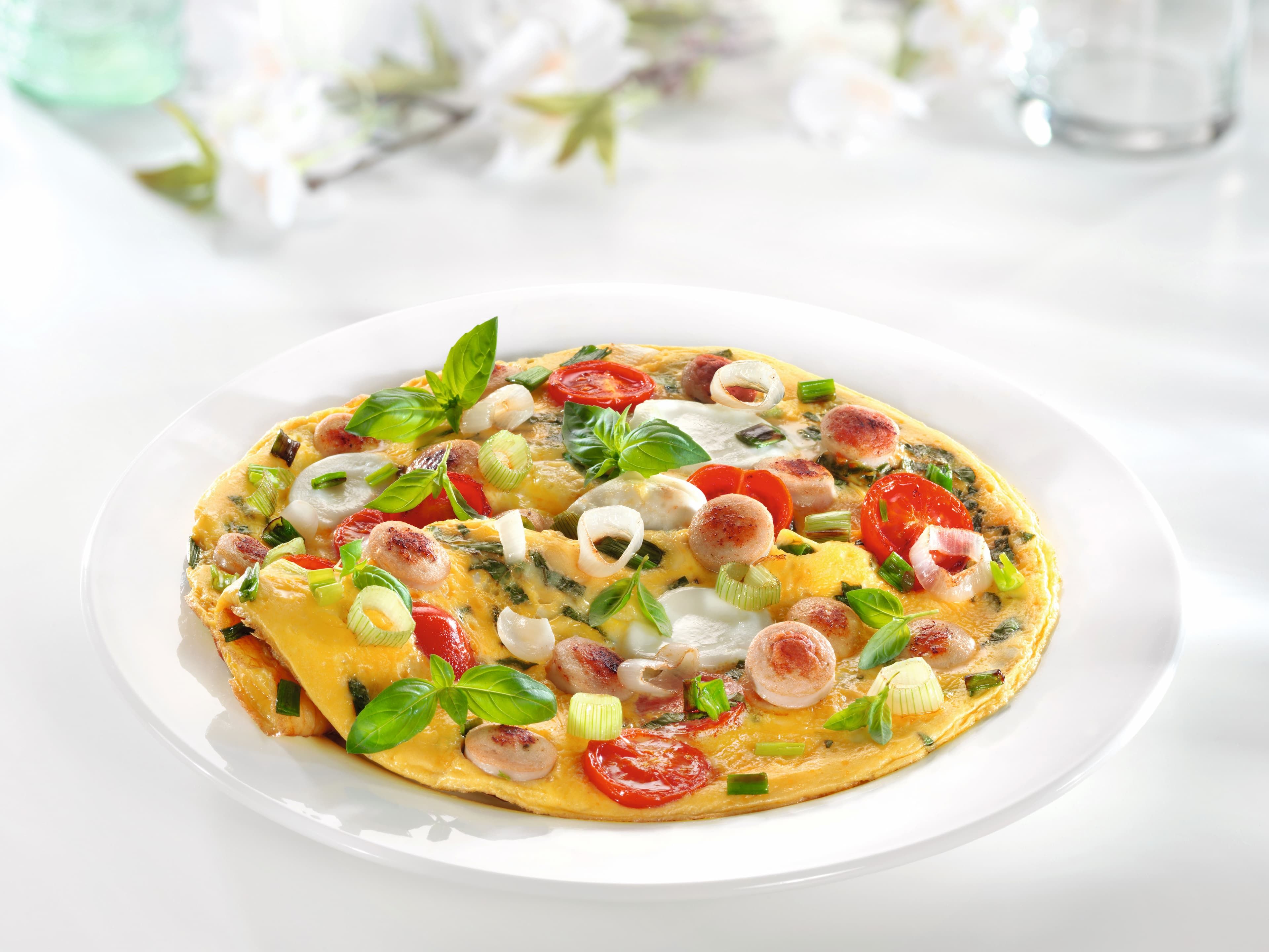 made from three eggs with veal sausage, buffalo mozzarella and healthy vegetables such as spring onions and cocktail tomatoes, garnished with basil