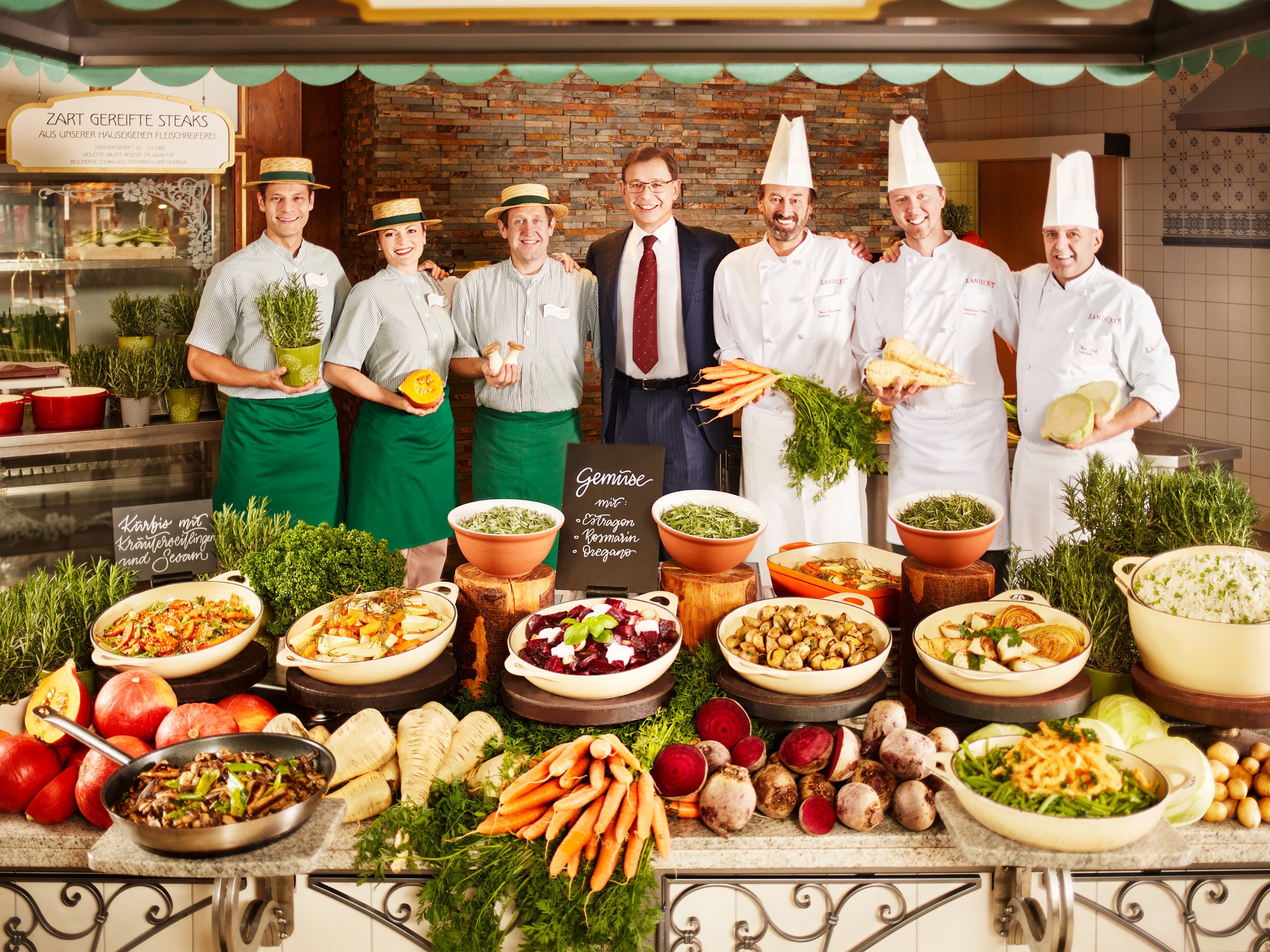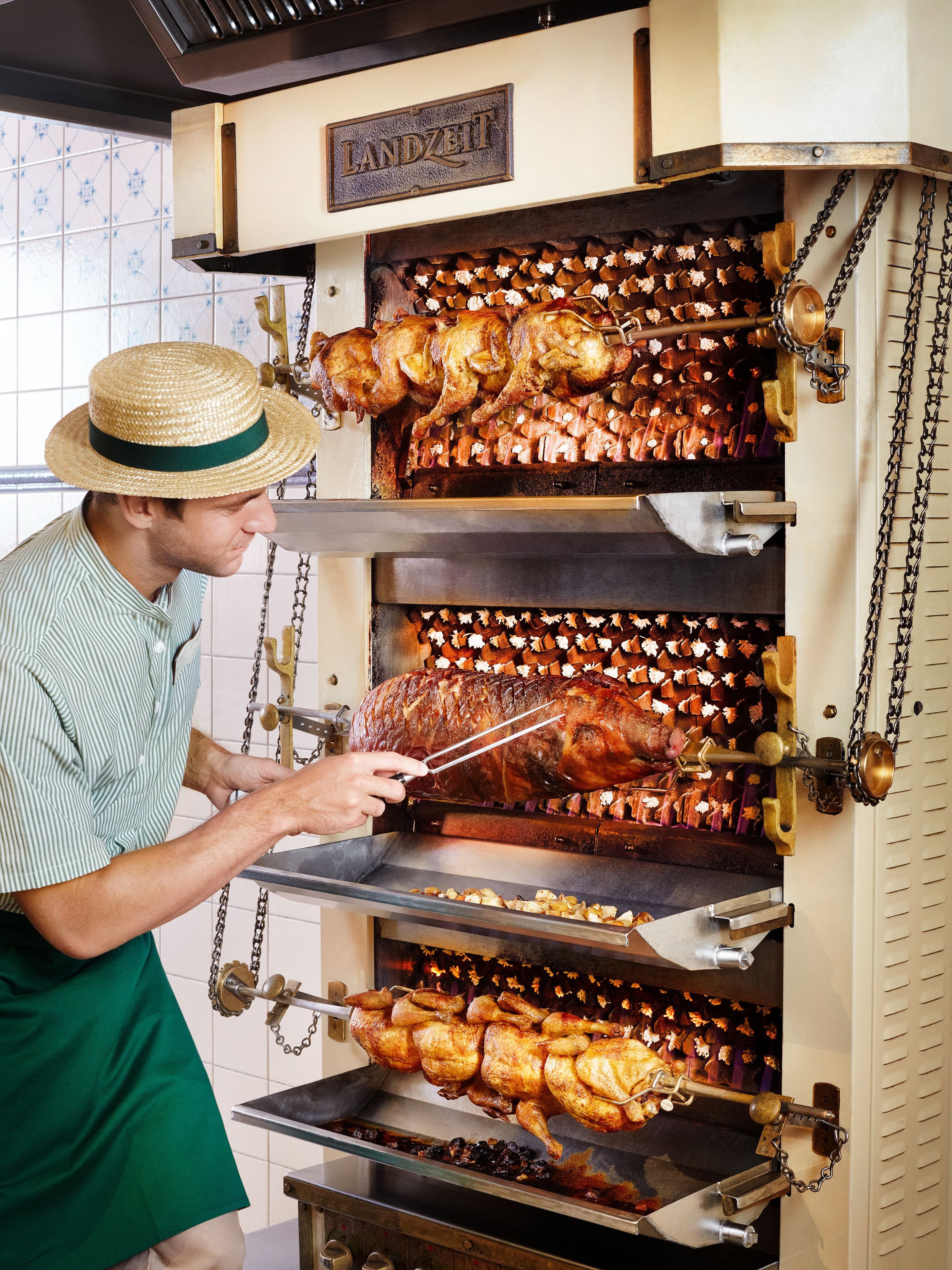 Fire with 1000 glowing wicks – the chain-driven skewers, including a drip tray with vegetables, result in perfect rotisserie flavour, the meat becomes particularly tender. The finest roasts, stuffed chickens, suckling pigs and stilts come off the wall of fire. The juices from the pieces of meat drip into the drip tray with the vegetables and produce the perfect gravy.
