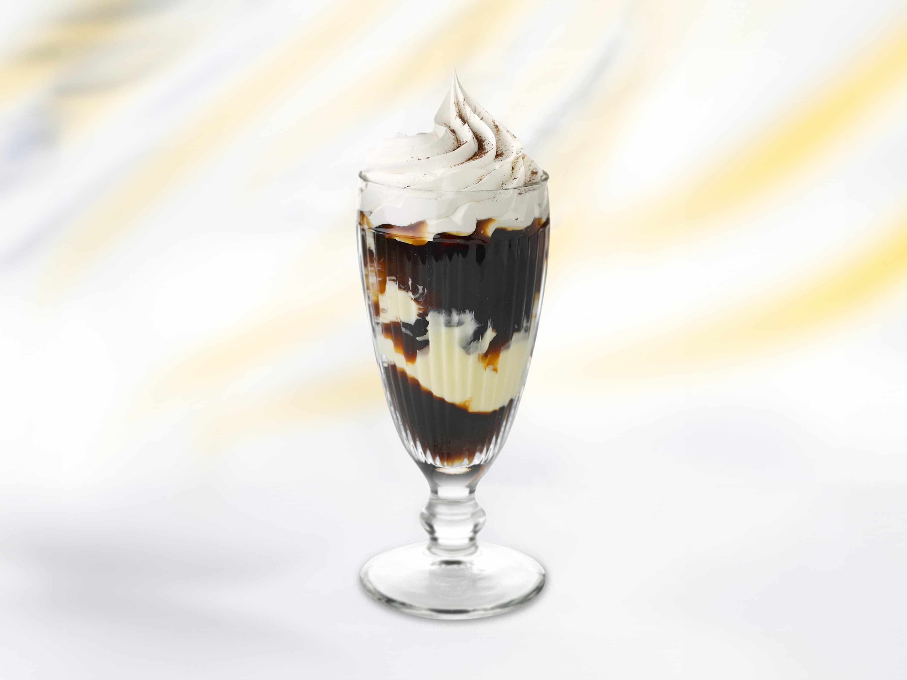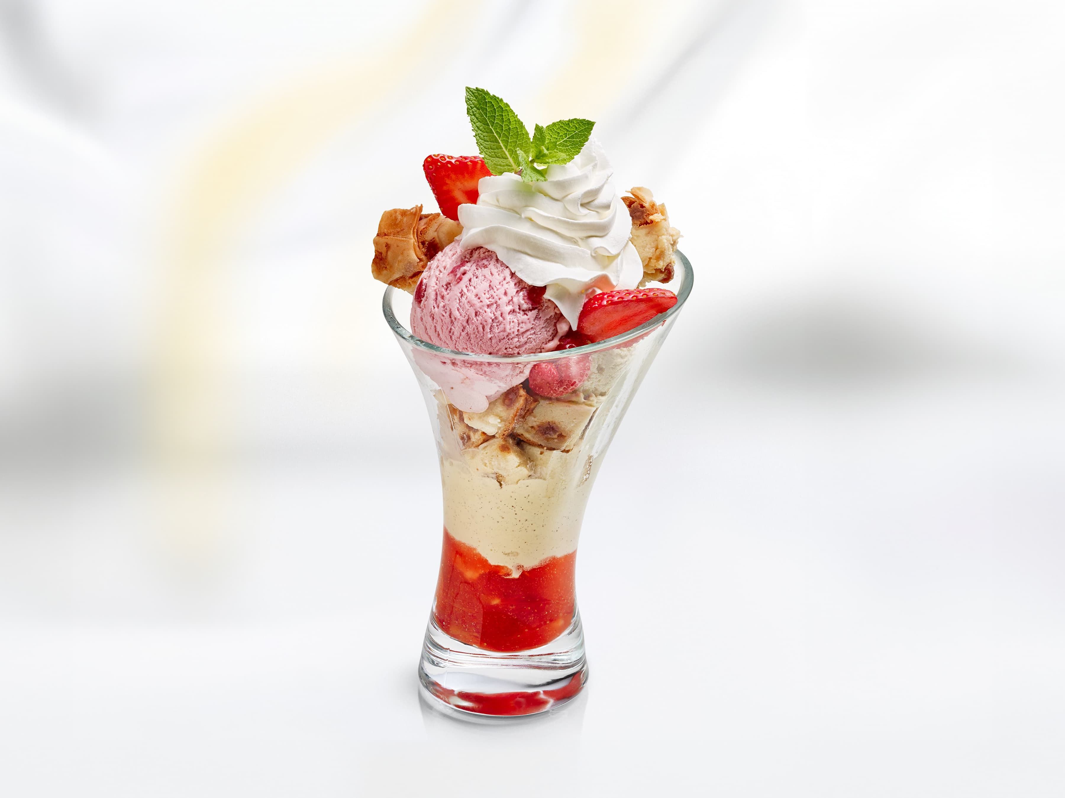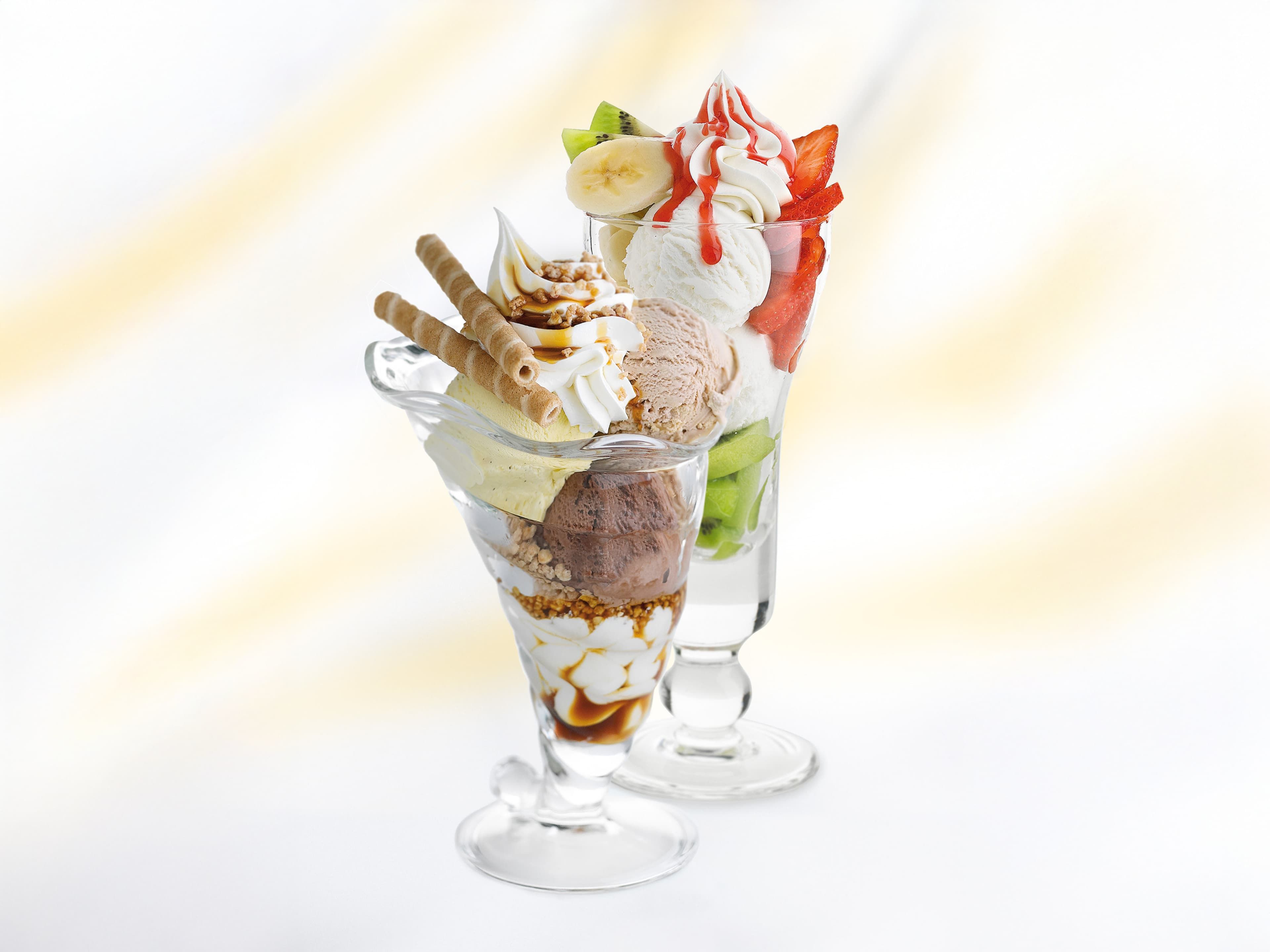 Zwei Eisbecher, zwei Geschmackswelten: zart schmelzendes Haselnuss-, Vanille- und Schokoladeneis mit knusprigem Haselnusskrokant, verfeinert mit Karamellsauce und Schlagobers, oder ein erfrischend-fruchtiges Erlebnis mit cremigem Joghurteis, Erdbeeren, Bananen, Kiwi und Fruchtsauce.