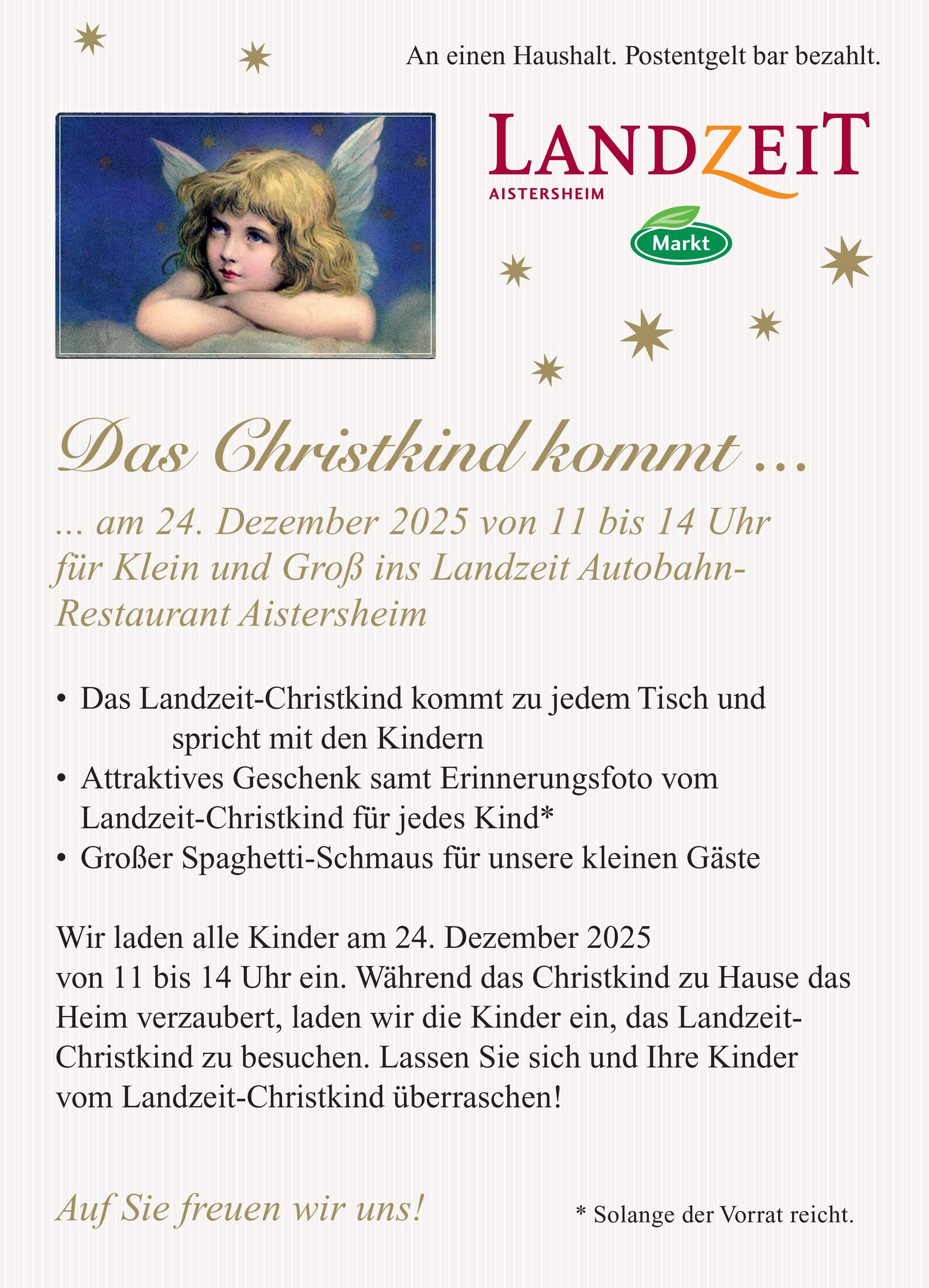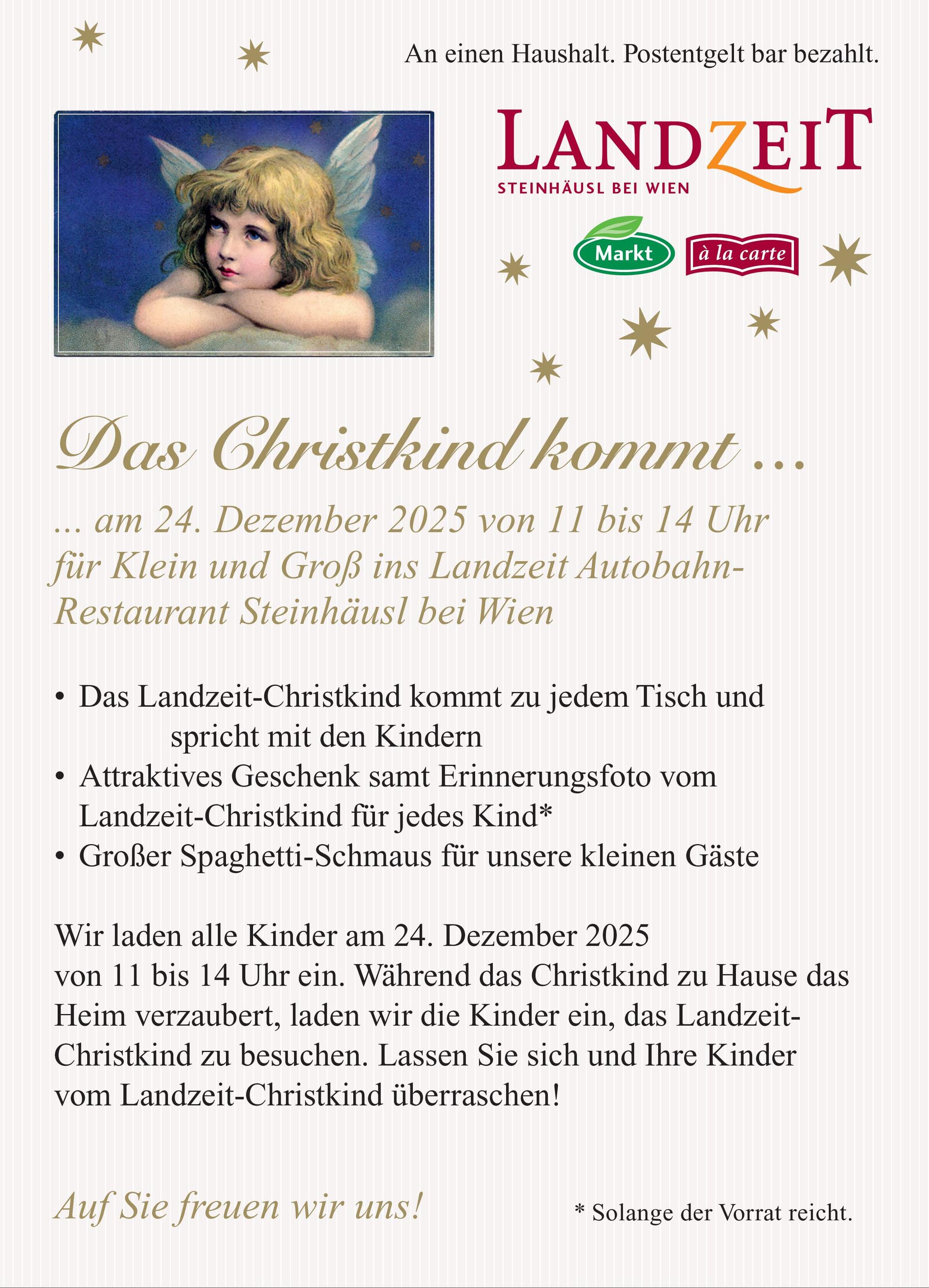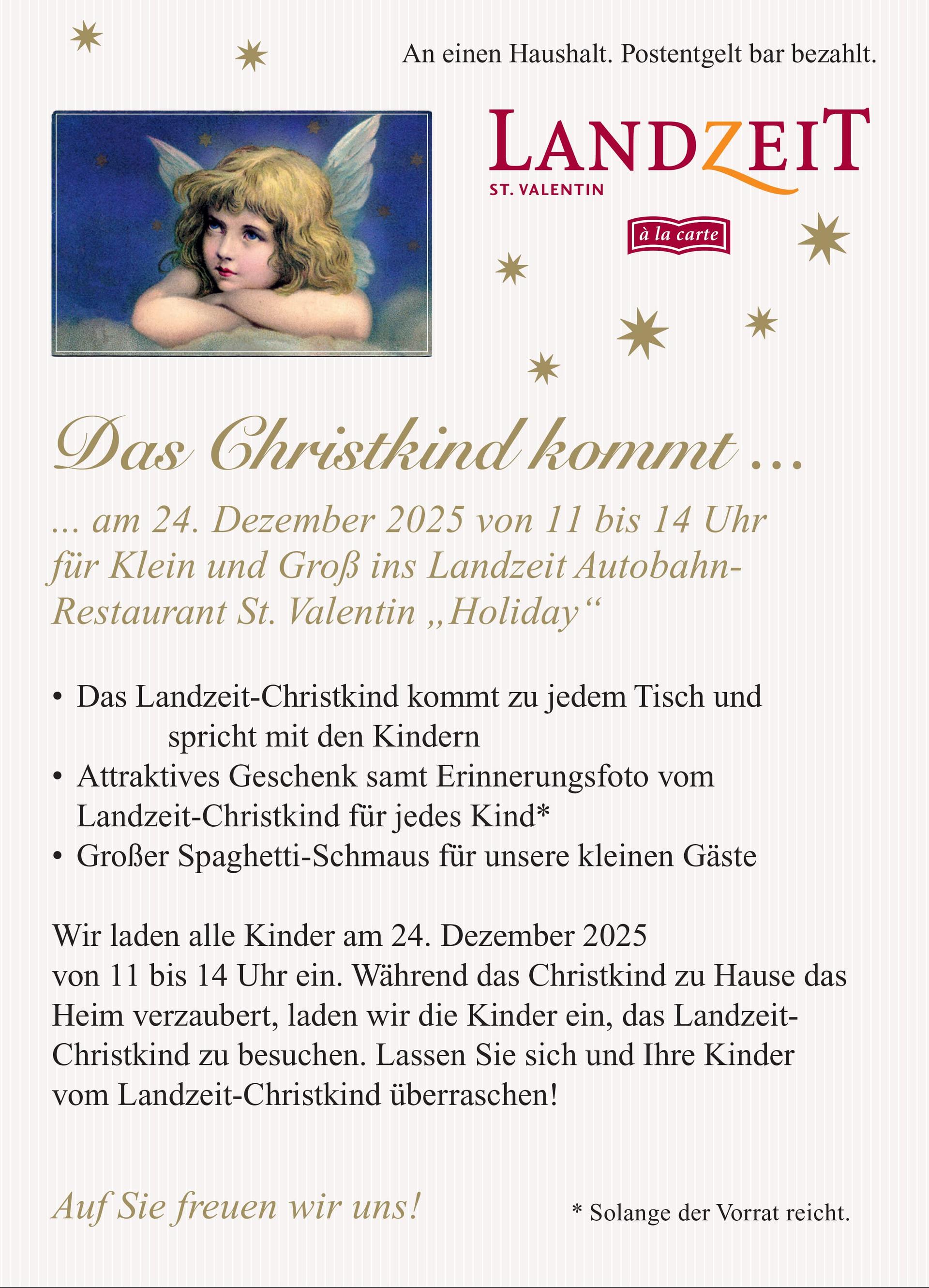 Das Christkind kommt am 24. Dezember von 11 bis 14 Uhr für Klein und Groß in die Landzeit Autobahn-Restaurants Aistersheim, St. Valentin „Holiday“, und Steinhäusl bei Wien.