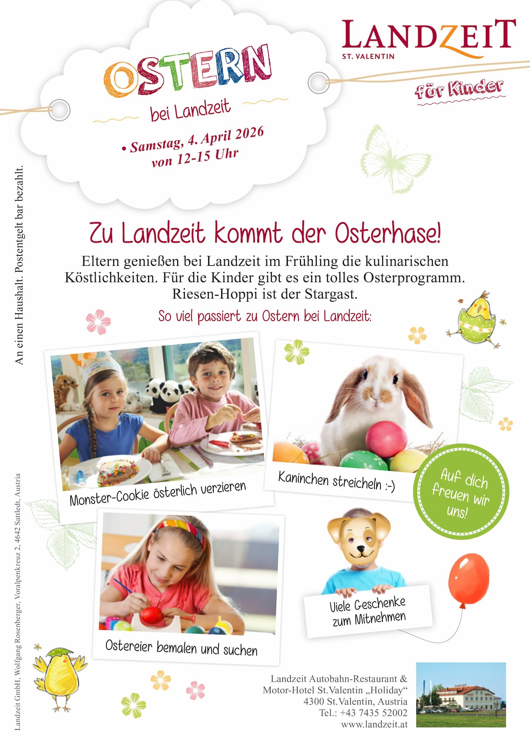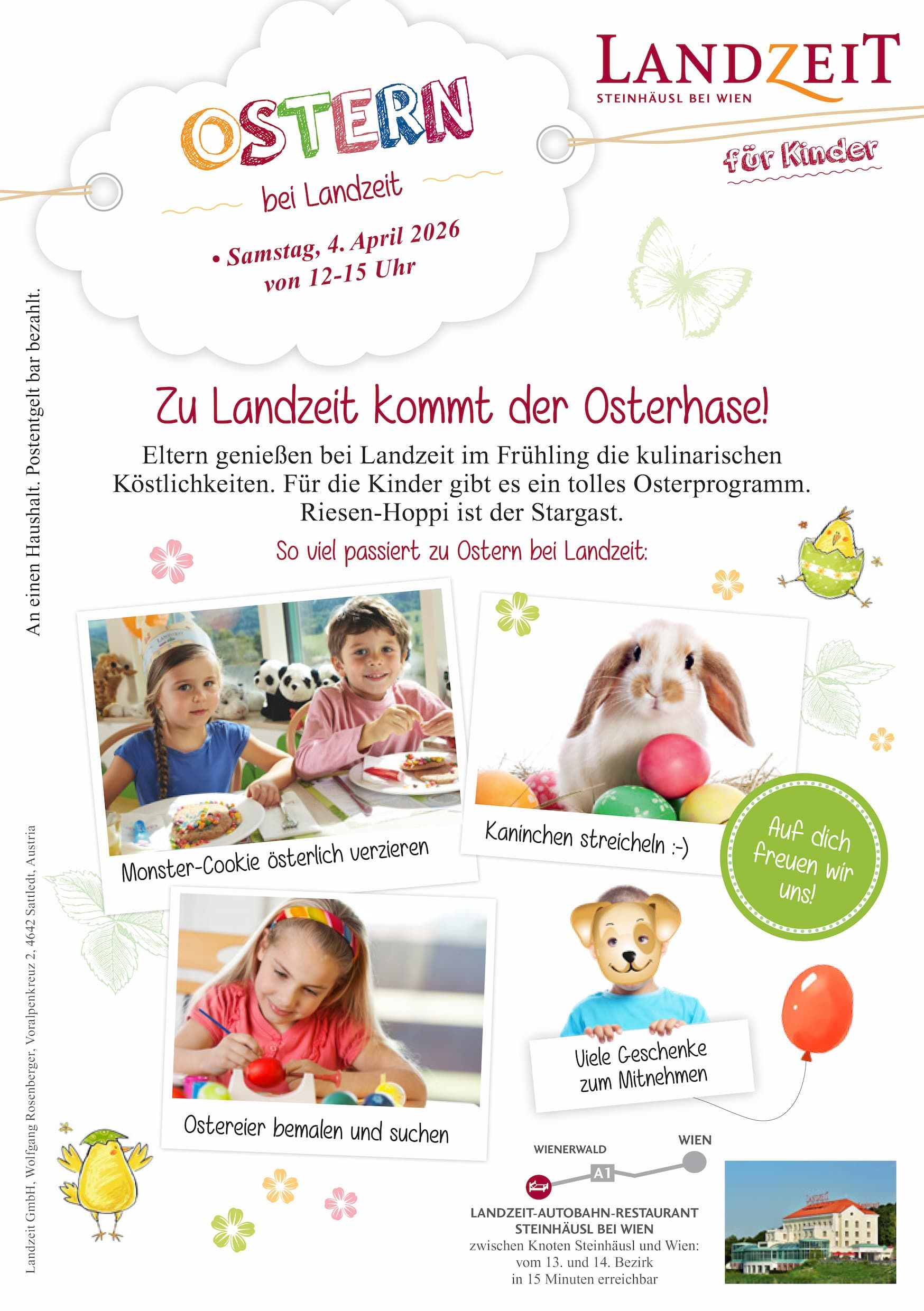 Eltern genießen bei Landzeit im Frühling die kulinarischen Köstlichkeiten. Für die Kinder gibt es ein tolles Osterprogramm. Riesen-Hoppi ist der Stargast.
